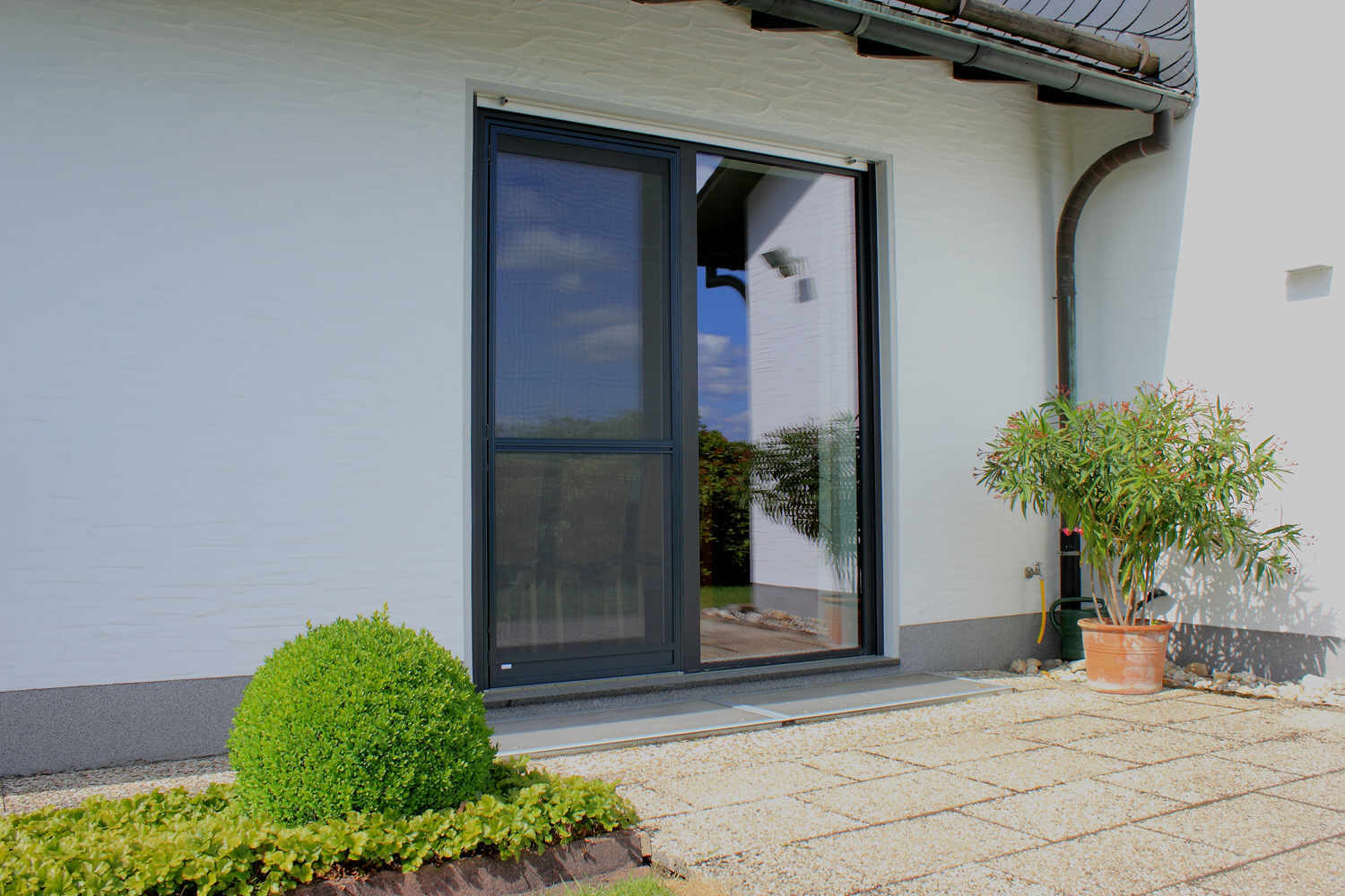 Für große Öffnungen wie Terrassen- oder Wintergartentüren sind Schieberahmen mit Fliegengitter eine sehr komfortable Lösung.